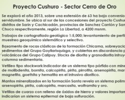 1. Proyecto Cushuro - Sector Cerro de Oro2. Panorama del área de trabajo3. Lineas de muestreo de rocas y áreas para muestras de coluvios y calicatas4. Muestreo de rocas con cortadora manual5. Muestreo de calicatas6. Muestreo de coluvios Atrás