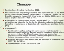 Chanape1. Equipo de reconocimiento arqueológico2. Panorama área reconocimiento3. Campamento de empresa perforación4. Cabaña de pastores5. Laguna Chanape6. Labores mineras antiguas7. Evidencia arqueológica en bofedal8. Abrigo rocoso9. Abrigo rocoso con paravientos10. Supervisión arqueológica11. Plaza de armas de San Damián Atrás