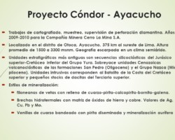 1. Cóndor2. Cóndor en su hábitat3. Campamento Cóndor4. Plataforma de perforación - RAM PERU5. Logueo rápido6. Técnicos Daniel Grados y Enrique Aybar7. Muestreo con cortadora portátil8. Paisaje en el proyecto Cóndor al atardecer9. Puesta de sol en el proyecto Cóndor Atrás