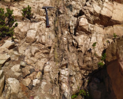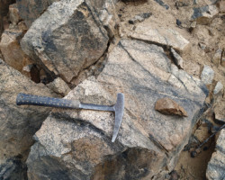 5. Estructura cizallada con epidota y magnetita en el granitoide. Evento distal a cuerpos de magnetita con óxidos de cobre.