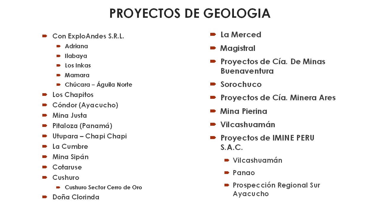 - Organización y monitoreo de programas de exploración con asesoría a nivel gerencial.