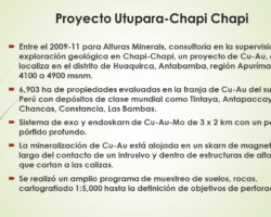 1. Utupara-ChapiChapi2. Visita de Peñoles3. Visita de Alturas Minerals4. Asamblea Comunal en Huaquirca5. Campamento Utupara6. Utupara Chico Sitio Arqueológico7. Llameros. viajeros de Cotahuasi a Antabamba y Santa Rosa8. Área de Muestreo de suelos en Chapi Chapi9. Equipo para Muestreo de suelos en Chapi Chapi10. Topografia para las líneas de muestreo de suelos en Chapi Chapi11. Muestreo de suelos en Chapi Chapi12. Perfil de Muestreo de suelos en Chapi Chapi Atrás Siguiente