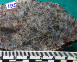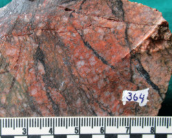 8. Brecha cuarzo-sericítica cloritizada, con playas de agregados granulares de martita (pseudomorfosis de magnetita a hematita) y hematita parcialmente reemplazada por goetita; crisocola botroidal y malaquita en costras y microvenillas.