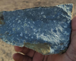 4. Intrusivo granodiorítico sericitizado con turmalina diseminada y en venillas en el tren noroeste de alteración hidrotermal.